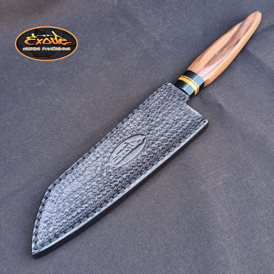 Combinación de material técnico y madera natural. La micarta aporta estabilidad frente a humedad; el Pau Ferro suma carácter y resistencia. - Vaina de transporte en cuero vaqueta